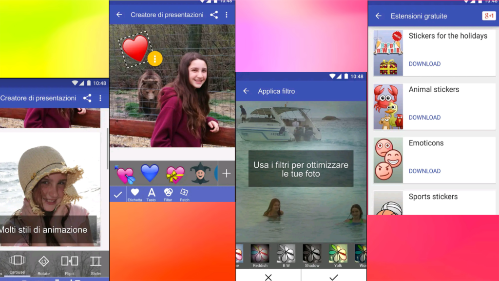 Questa app l’ho trovata particolarmente utile perchè contiene delle transizioni tra una foto e l’altra molto singolari. Anche in questa app è un po’ difficoltoso pescare dalla galleria le foto ma alla fine l’effetto è molto particolare