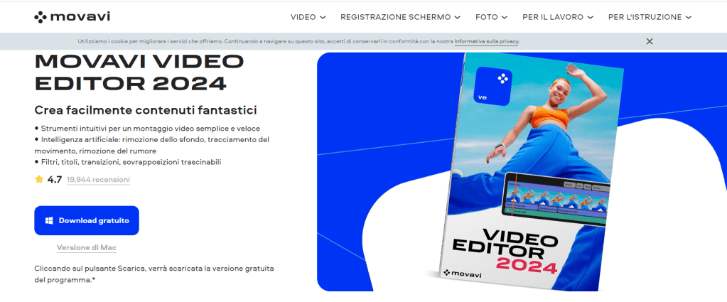 Questo software si può scaricare sia nella versione per windows sia nella versione per Mac. Lo uso da ormai 3 anni, è soggetto ad abbonamento mensile od annuale, altrimenti i video saranno soggetti a marchiatura centralizzata Movavi, quindi inutilizzabili. Ricco di nuove transizioni e contenuti nella versione 2024, lo consiglio vivamente. E’ davvero utile, quindi vale la pena fare l’abbonamento annuale. Esiste anche nella versione APP ma non la uso poichè è più comodo il montaggio fatto con il pc